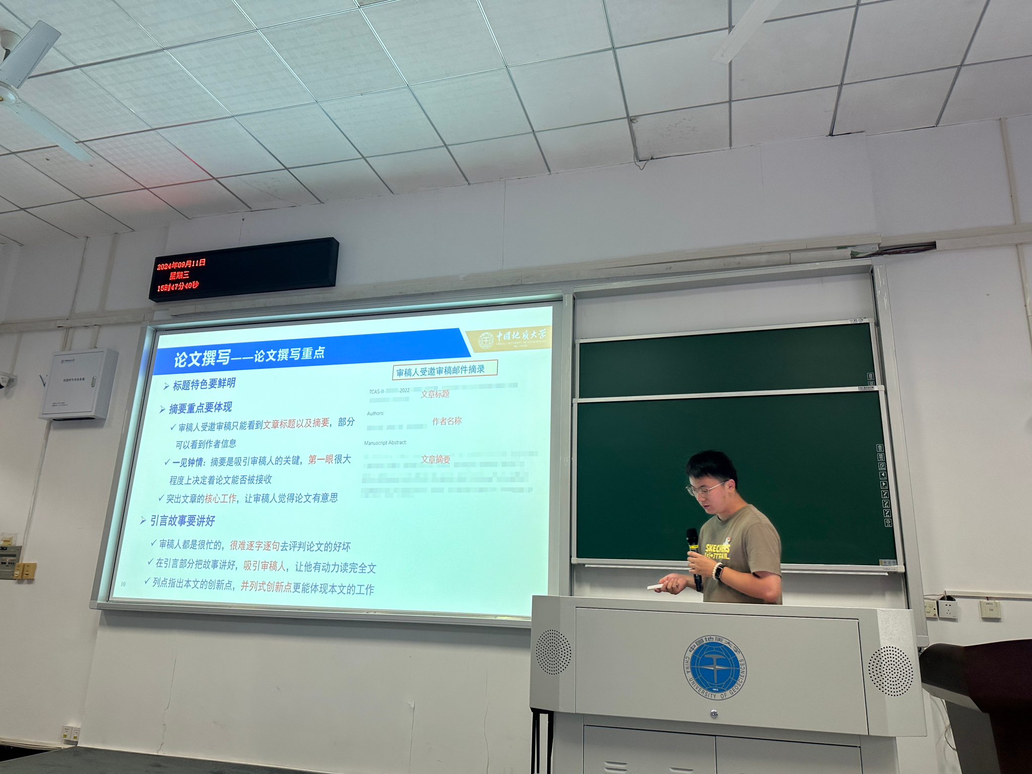 随后,陈文虎则围绕“学术研究与论文撰写”进行专题分享。他从方向选择、论文写作、论文投稿等方面分享了自己的经验,特别强调开展学术研究要多与导师沟通交流,多读文献,在创新与实践中锻炼中不断发现问题,解决问题,勇攀科研高峰。